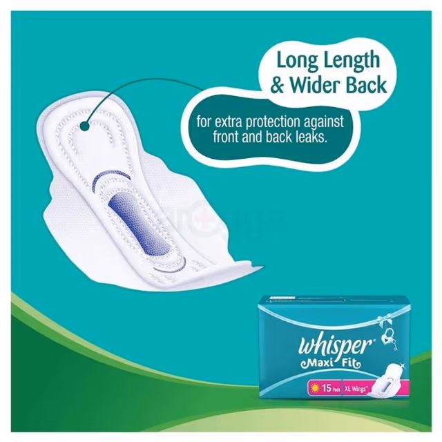 Whisper Maxi Fit Sanitary Pads with Wings L+ offer heavy flow protection in a 15-piece pack, featuring extra-long length and wider back for superior front/back leak prevention. The super fit cushion contours to the body for centered absorption, while the Dri-Weave topsheet keeps skin clean, dry, and rash-free throughout periods – ideal for active days with cotton-like soft material and disposable design.